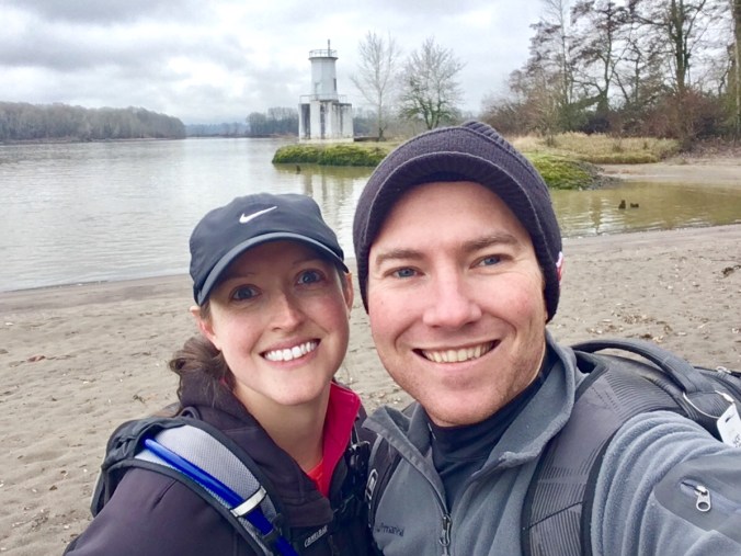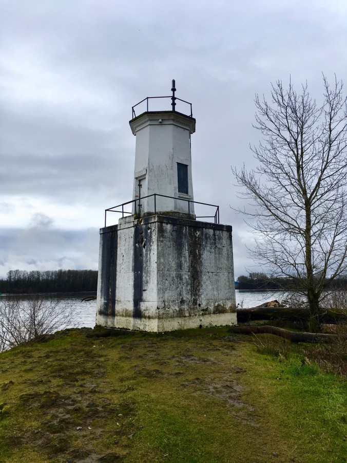 As we got deeper into the hike, the trees turned deciduous and the leaves on the path made for less mud, making it a much more enjoyable hike, since we weren’t dodging big puddles or mud pits. It was fairly smooth sailing, and we didn’t see a single soul on the way out (only kind of creepy). I could tell we had to be getting close to the lighthouse when the trail made a big curve back out towards the Columbia River. Behind me I heard, “We came around the back of it! I was NOT expecting that.” Huzzah, just in front of me, beyond the trees was the lighthouse.
