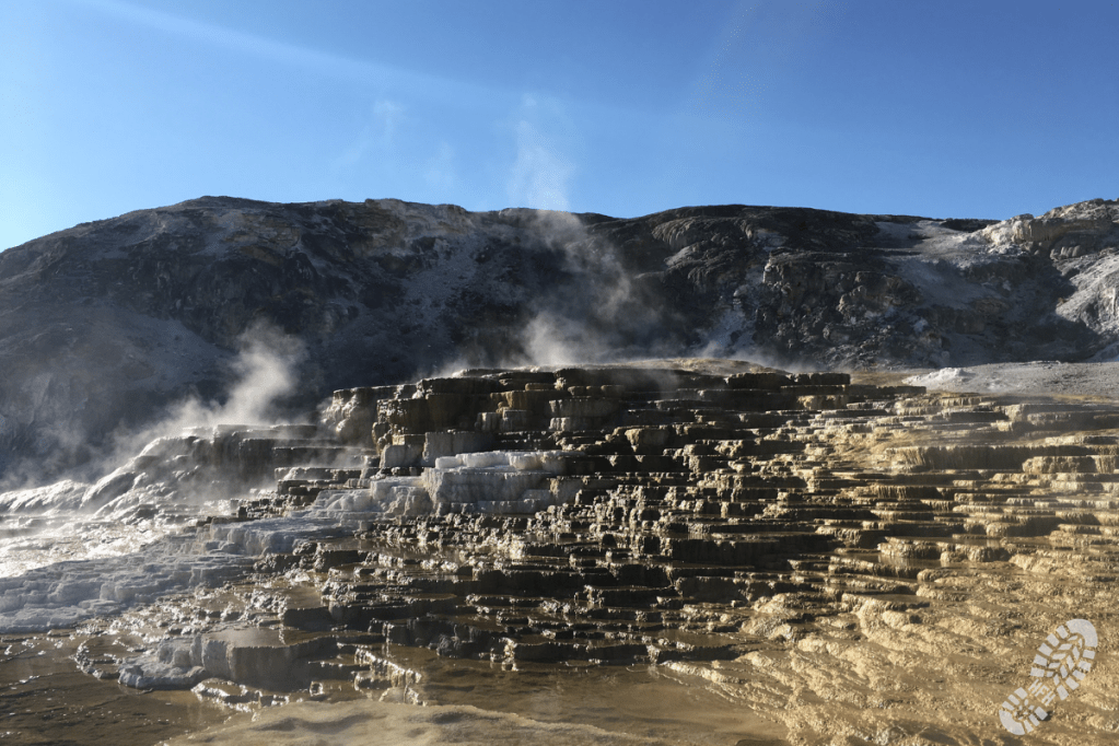 The key to enjoying Yellowstone as much as possible is to arrive EARLY! This can be challenging if you have kids or are staying a ways outside the park, but I promise that it’s completely worth it. The Mammoth Hot Springs are no exception. Parking is easier, the boardwalks aren’t crowded, and you can see the steam rising off of the hot springs (which aren’t always visible in the flat light of a grayed-over afternoon).